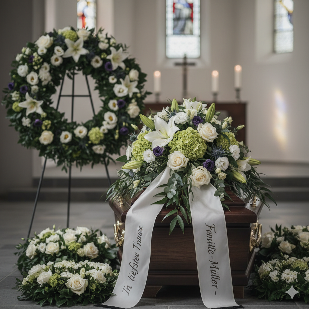 Wir gestalten Sargschmuck, Kränze, Urnenschmuck, Trauergestecke, Familiengestecke sowie Handsträuße und Tischdekorationen. Alles wird würdevoll und individuell gefertigt.